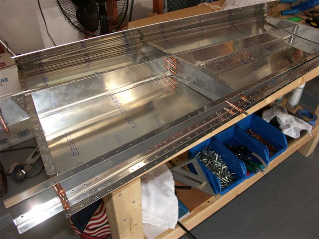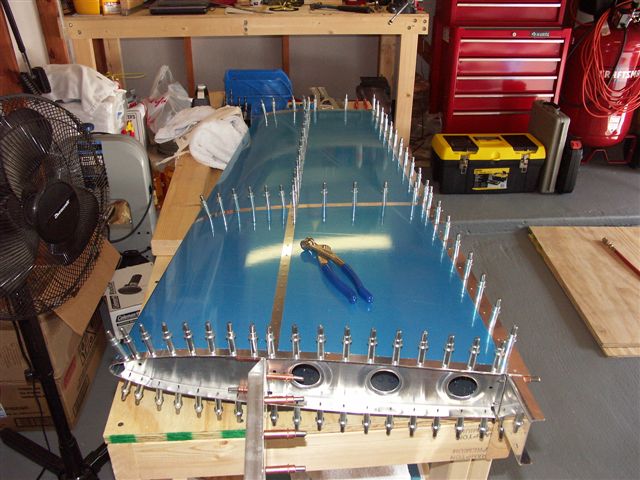 Received the new front and rear spar for the right side of HS. Clecoed ribs to spars and attached right skin. Final drilled all holes in spars.