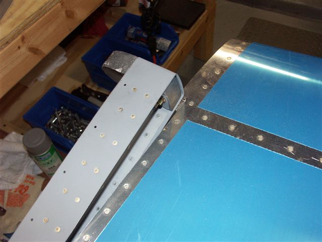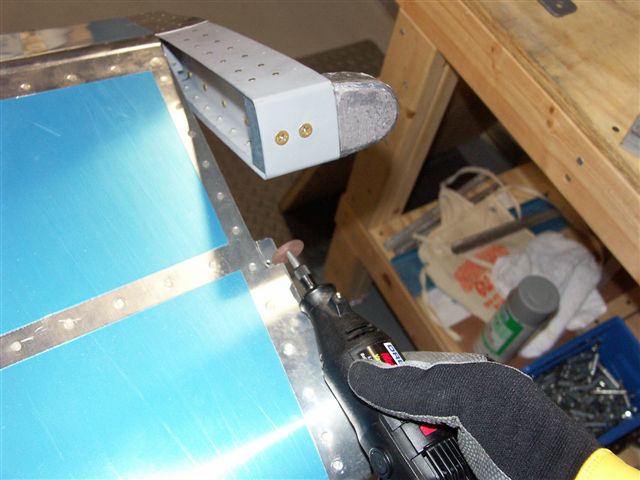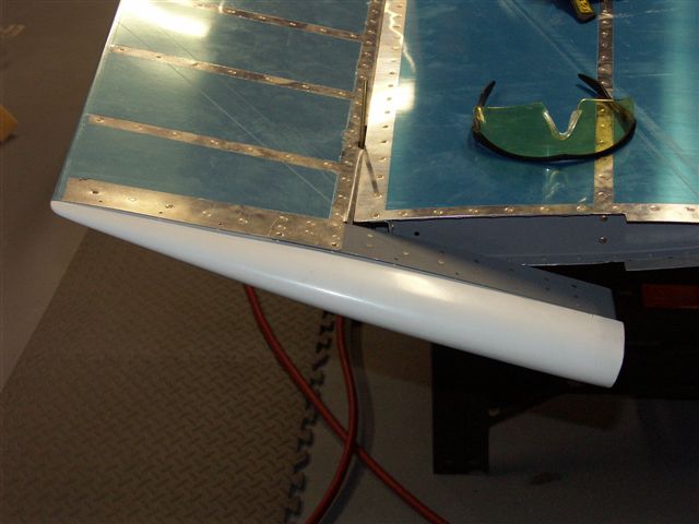 Last I cut the front edges of the fiberglass tips to clear the lead counterweight. They are ready to install the stiffener strips and drill rivet holes.