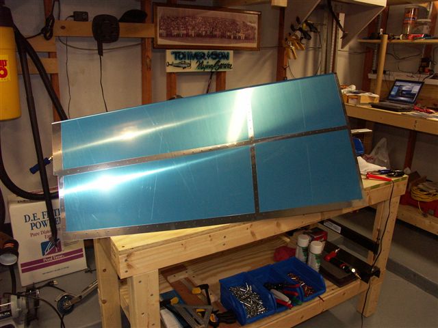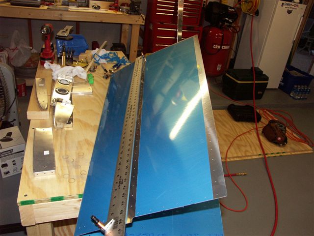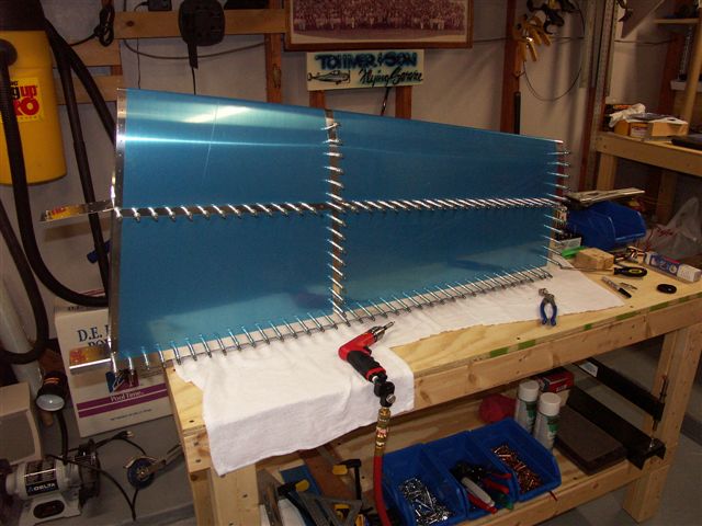 Left side HS. Used soldering iron to trim off blue plastic from rivet line. Clecoed leftside HS ribs and spar together. Clecoed left skin to frame. Started to final drill to #40 bit.