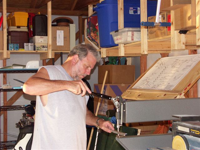Next I primed the stiffeners with GBP-988. I set up the back rivet board I made by recessing my 1/4 inch steel back rivet plate into a plywood board. It worked sweet as well. Except for when I started on the first stiffener I made a major screwup. I was so excited on how smooth everything was going I setup the rivets into the bottom of the skin. I used the rivet tape to hold the rivets in place. Turned the skin over on top of the backrivet board. I kept thinking I was forgetting something. You know like when you are going on a trip and you feel like you are forgetting something. Well anyway I proceeded to backrivet each rivet just as nice as you please. Then it hit me. You forgot to lay the stiffener on top of the rivets. What a dumbass! Nothing like having to drillout 18 perfectly set rivets and hope you don't screw up the thin rudder skin. Anyway I lucked out and each one came out easy and I didn't mess up any holes in the skin.