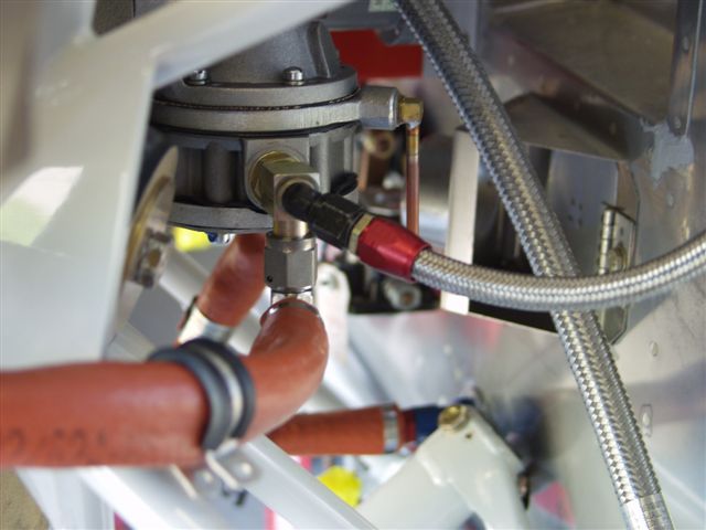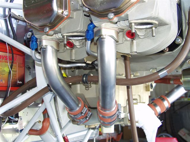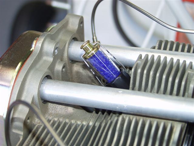 Last I put the dehydrator plugs in the sparkplug holes. I forget there are 4 on the bottom as well. These stay in until first engine start to keep out moisture. I switched out the restictor 45 fitting with the plain one for the fuel pump sensor and installed the overflow tube. I need to wait until the cowl gets installed to see where the best place to install the remote tube needs to go.