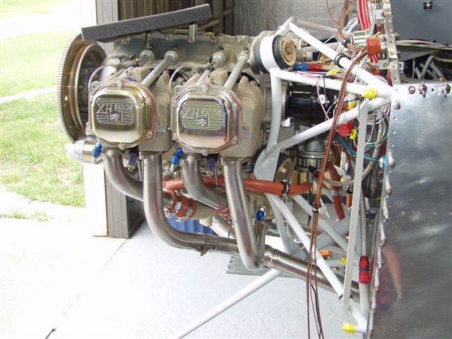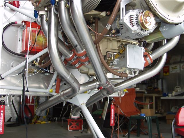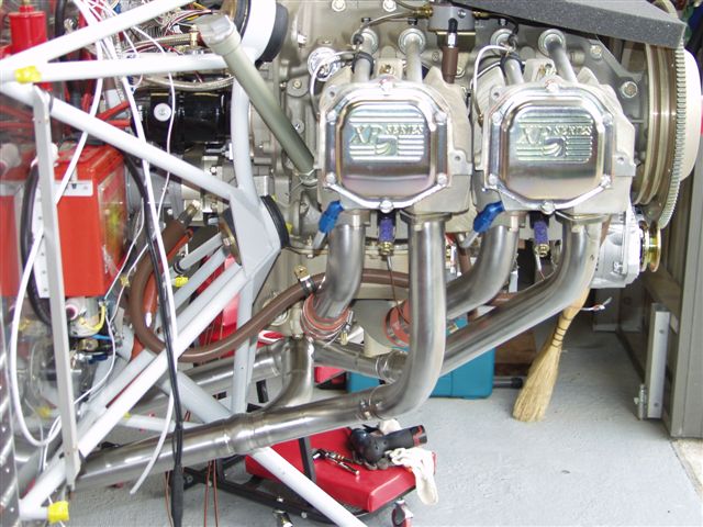 Next while Gary was there he helped me bolt up the exhaust. The issue is you have to insert a piece from one side of the engine and then bolt up both sides at the same time. Looks pretty sweet. Things are starting to get tight now.