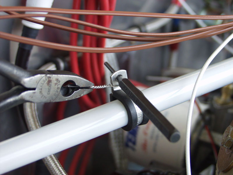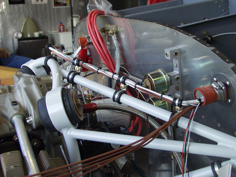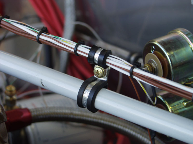 I used this trick from VAF to install Adel clamps. I used a punch to align the holes and safety wire to hold it in place until I got the screws in place. I now have the outside wires figured out and the ones that pass behind the firewall. I ordered the bolts from Van's. Now I need to order the shorter cable and can complete that part of the install.