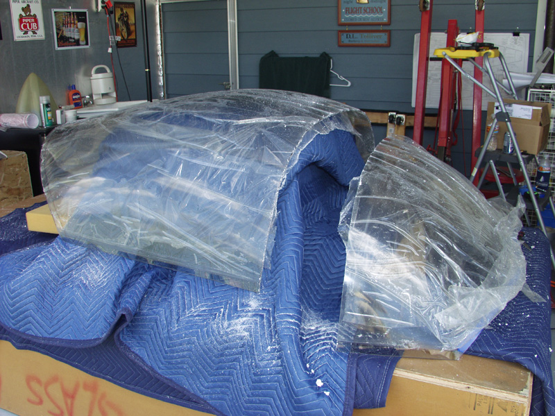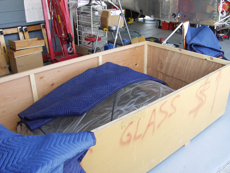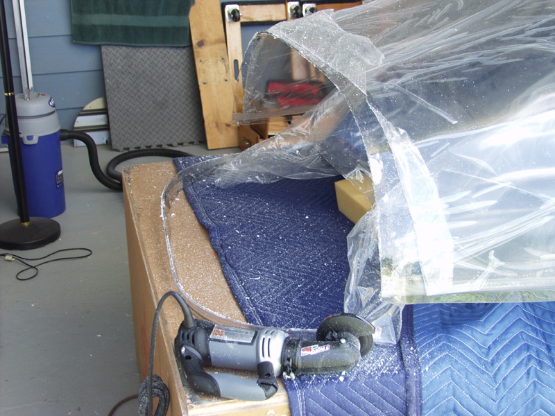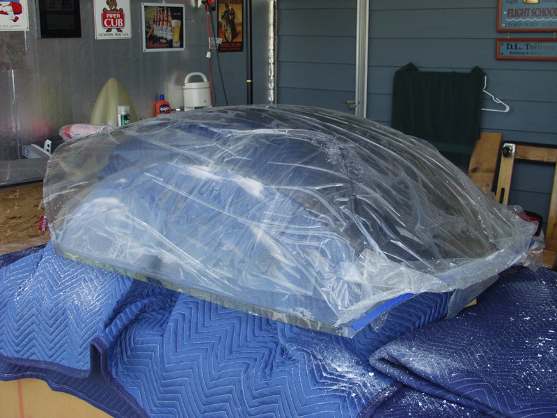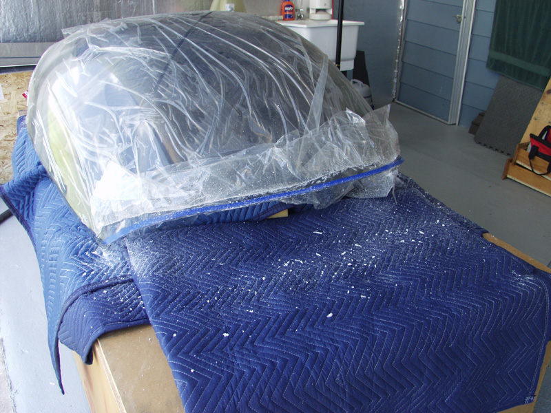When we got back to the hangar I cut the straps holding the canopy in the create and we lifted it out. Flipped over the create to make a work surface. Jon suggested putting a box on top in the middle and using the blankets to hole the canopy off the top of the create to keep the pressure off the sides. The plan was to cut a strip off the back as a test to see how the Rotozip tool would work. Worked great.