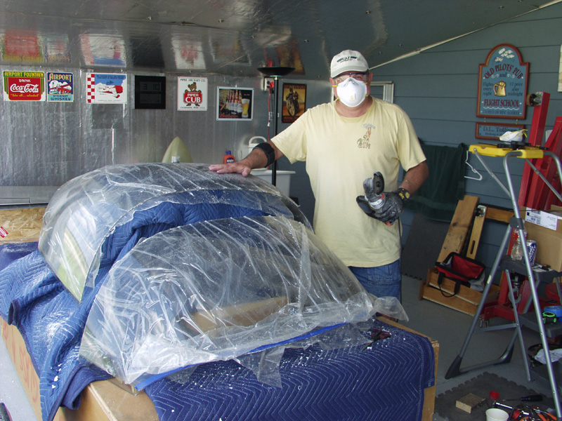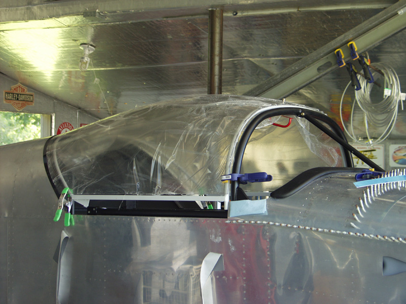 Next Jon marked the front edge with electrical tape to see if I could follow a line. Worked great so we set the canopy on the plane and marked the place for the hole in the top of the frame for the canopy latch. We removed it and drilled the hole. Put it back on the frame and marked the line to make the cut that seperates the windscreen. Then it was time. I marked it in the gap between the rear of the roll bar and the front of the slider frame. Removed it and made the CUT! It's now done. Next we put the windscreen aside and put the slider portion back on to mark the sides. 2 more cuts and we were done. Thanks again Jon for your help. If would not of been there to help I would still be cuttin.