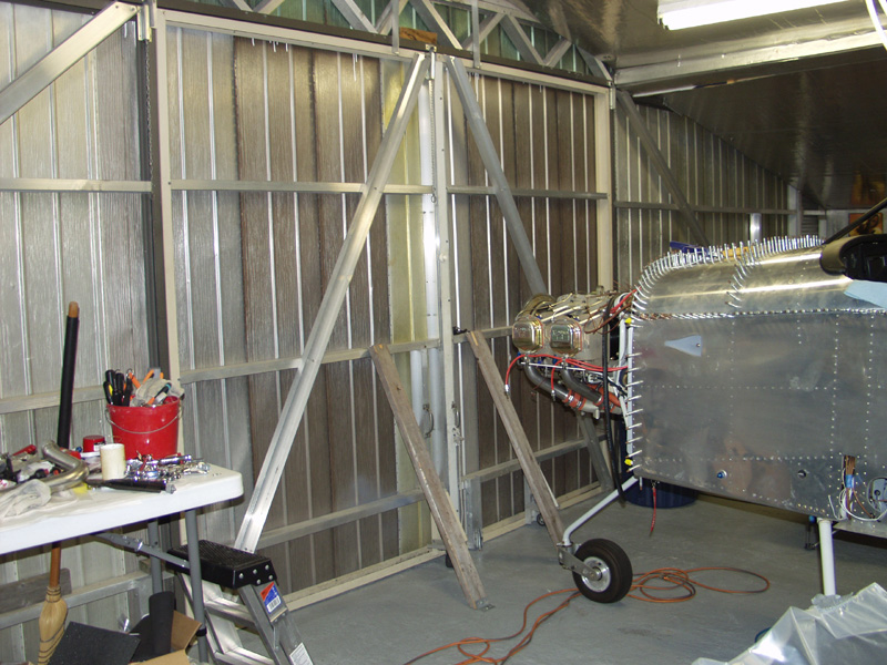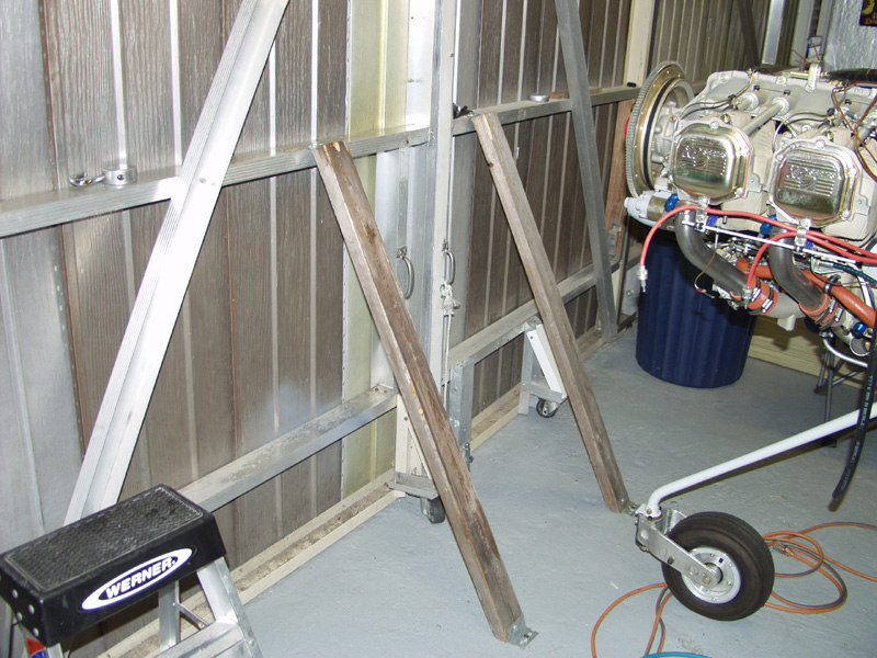 He also fabbed up 2 2 x 4's that mount along the front doors and angle down to the floor and mounted the bottom into the concrete. The prop spinner on his 6 and now the one on my 7 ends up being only about a foot front the front wall and if this ever blew in would be really bad. With these installed the doors become one with the front wall and very strong. Great job JON!