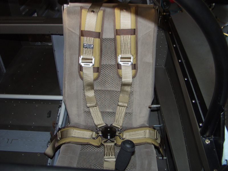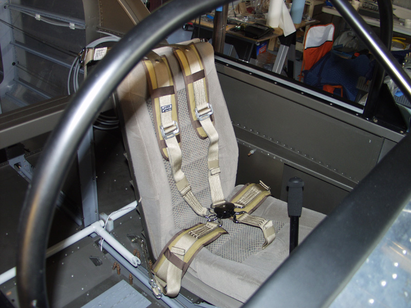 Next I installed the seat back and the bottom seat cushion pushing the crotch strap up through the hole in the seat cushion. Bolted the left and right seat belts in place. Hooked up the sholder straps to the cable that attaches to the rear tail cone longeron.