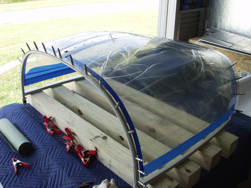 I reinstalled the glass to the frame to check the fit of the fiberglass rear trim. Fits very well. Just not sure how I can rivet it reliably. Its easy to lay it on and tape it to where it looks right. I am going to use some hole finders and drill and cleco while the canopy is partially open and see if I can get the fit right as I work my way around.