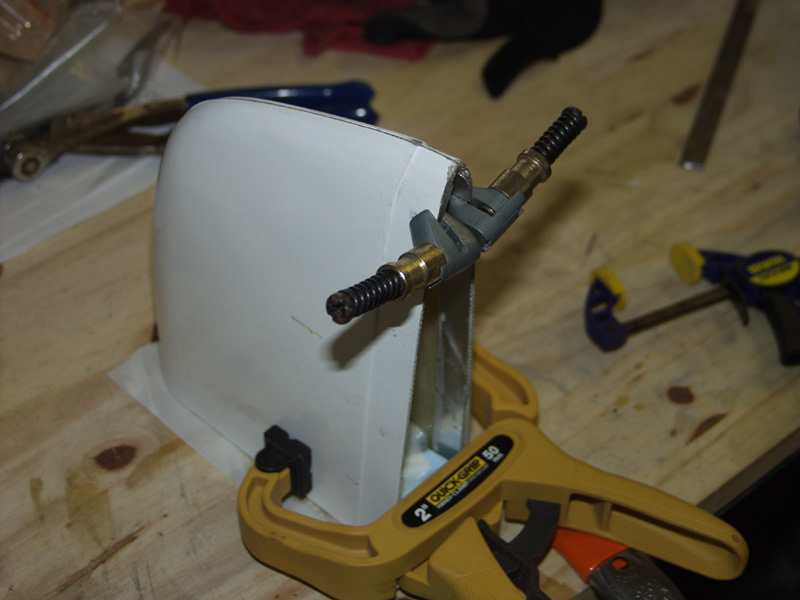 Once the foam was cut to fit I used a clamp to hold it in place. I mixed up some West Systems expoxy and used it to fill in around the foam and the metal strips. Then I mixed up some micro balloons with the epoxy as well and filled in even more. Once this is done I will fill in the back side to allow a smooth finish.