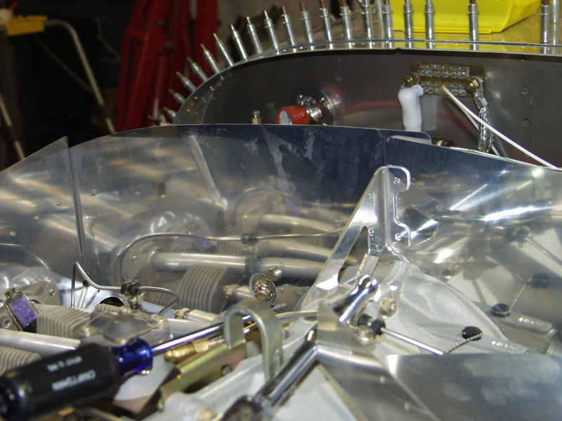 This time I installed the #3 baffle piece and then used the grinder to take off metal that was touching the engine caseing until I could cleco the rivet holes that hold these 2 pieces together. As you can see from the 2nd picture the back upper edges still dont line up exactly but that will be trimmed under the cowl anyway.
