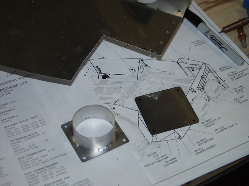 Next I used the fitting for the scat tube that connects to a predrilled hole on the right rear area of the baffle wall to make a patch for this hole. Turns out Van's moved the original position of this from the right front inlet to the rear. This is for northern climates where it gets really cold in the winter. When pulling air as it comes in the inlet I guess this cold air was not getting heated enough in the heat muff before entering the cabin. Several others have sais that if they were to do it over again with our southern climate they would move intake back to the front to not rob cooling air from this rear cylinder. Again just another way colabaration with others that have already flown and the forums helps minimize problems down the road. I will just rivet and seal the rear hole with this patch and use the scat tube fitting on the front inlet.