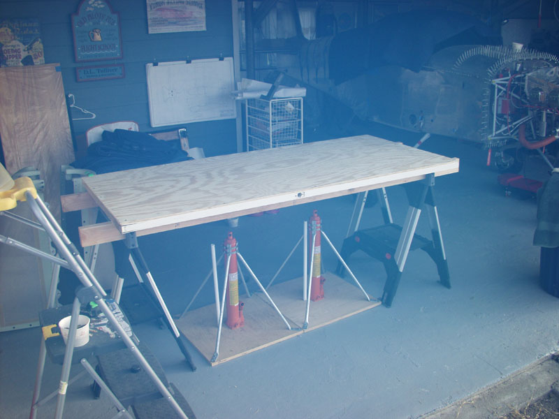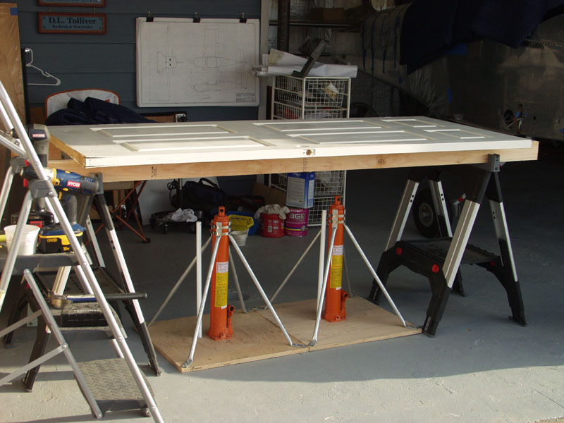Today I mounted a door on some 2 x 4's and set it up as a table. Then to make a smooth surface I mounted a piece of quarter inch plywood on it. Should work out great.