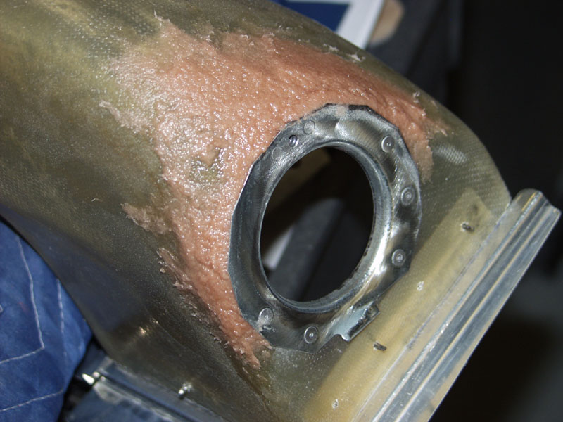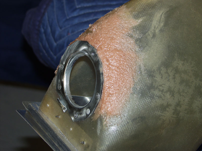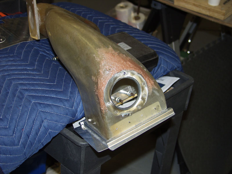 Installed the rivets and polished up the surface to make the cover plate open and close smoothly. Next I mixed up a batch of epoxy and flox really think so it would not run and spackled in around the edges. Should look nice once it sets up and I sand it all smooth.