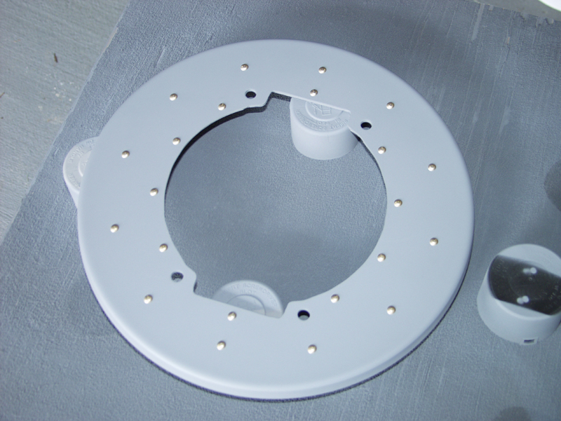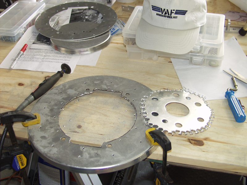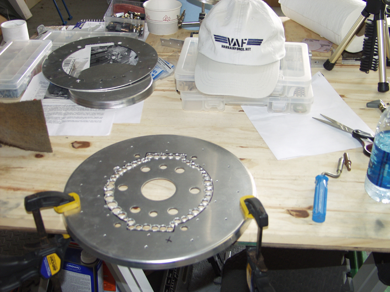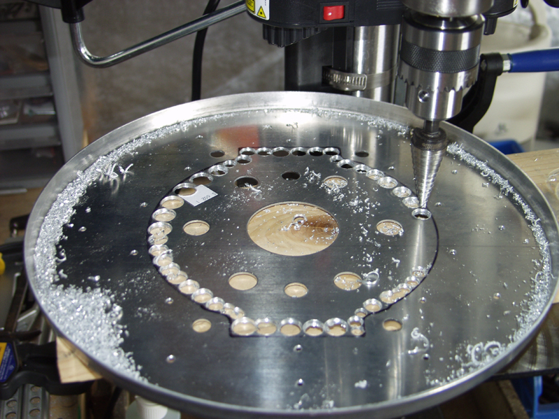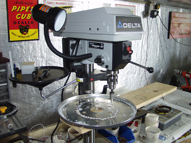 I wanted to get this prop spinner plate done before I move on to the canopy. I had to replace my drill press so I went with the Delta. It took me about 45 minutes to put it together and setup. Once that was done I started drilling holes with a unibit along the outline I wanted to cut out.