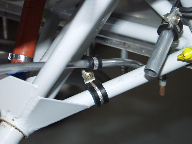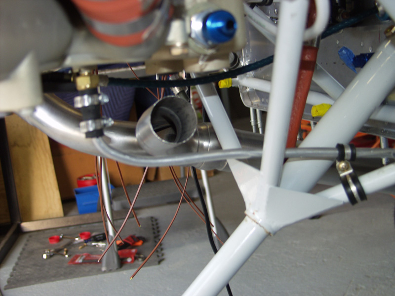 Next I worked on the sniffle valve. Vetterman recommends you remote mount a piece of tubing back away from the exhaust. I put the right rear cylinder exhaust on to measure clearance. Cut some rubber tubing to length from the sniffle valve and used hose clamps per the instructions. I clamped the tubing at the rear to dump between the 2 exhaust pipes. Should keep it really tight.