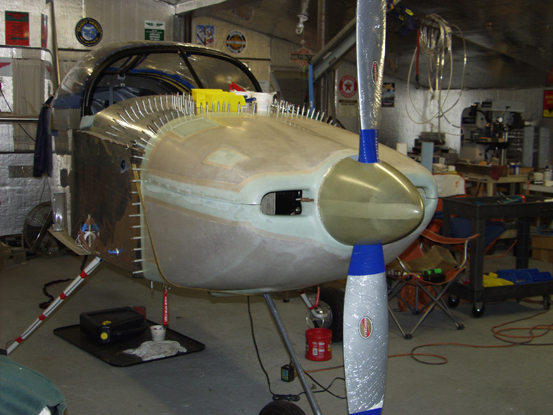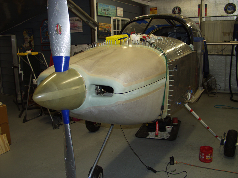 Now with all of the baffle pieces removed I could get the top cowl back in place and clecoed along the rear. Next I installed the lower cowl and used a bungee to hold in place.