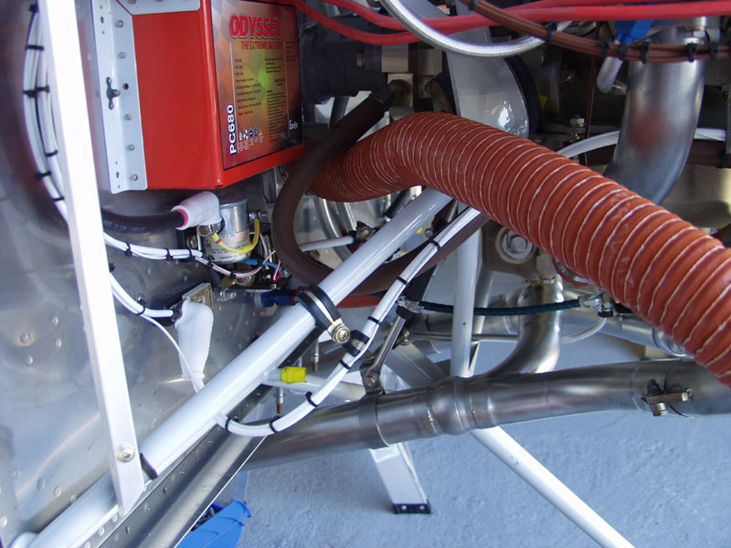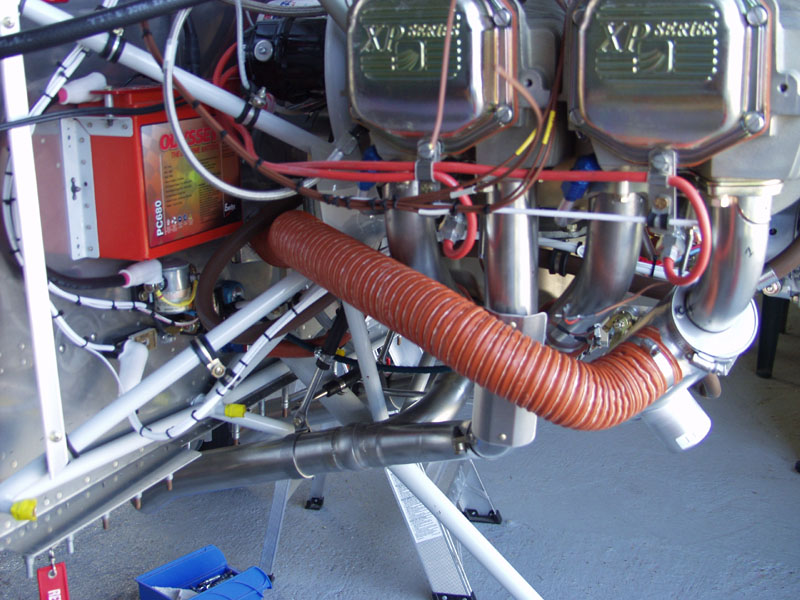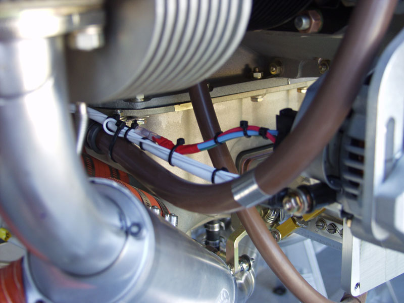 Finished running the field wire along the alt wire. Tie wrapped eveything neat and tight. Crimped the wire to the alt plug supplied from Vans. Verified from the Vans site that we are supposed to use the green wire only now. As I was working on this one of the Bonanzas on the field was doing his usual high speed low passes while warming up the oil. Pretty cool. Of course the RV will be cooler! Also received the new longer scat tube from Vans. So I installed it and the exhaust heat shield.