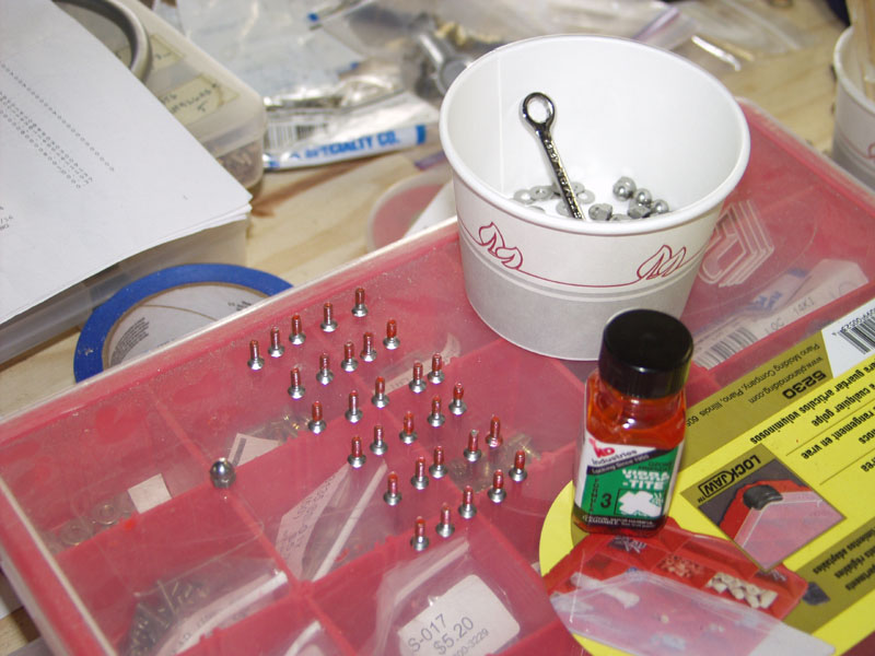 Today I wanted to get the emp fairing done and the canopy sides. I started with marking the trim lines and drilling the last holes where I need to tap and install nut plates. Next before I removed the fairing for triming I laid out 30 little soldiers (6-32 stainless screws) and dipped the tips in Vibratite so they could dry. While these dried I marked and drilled the last holes in the fairning including the bottom piece. Then I removed it and trimed to final shape.