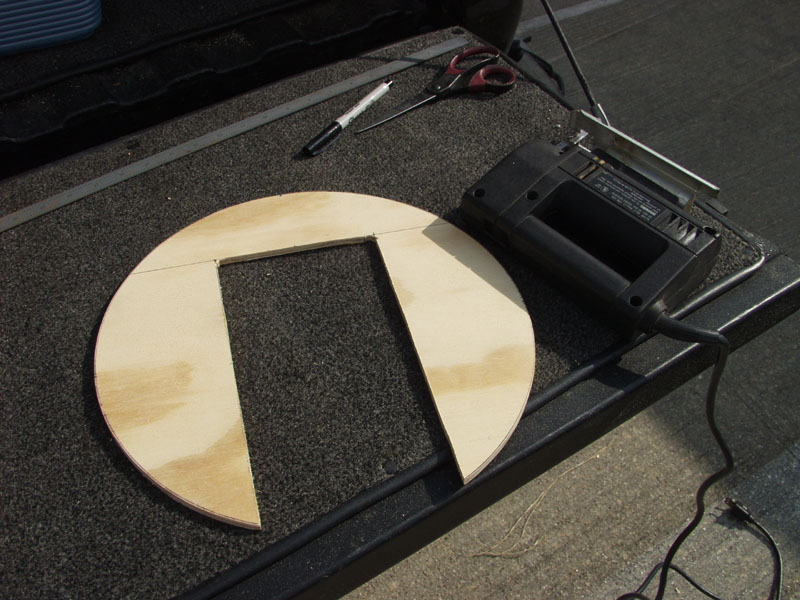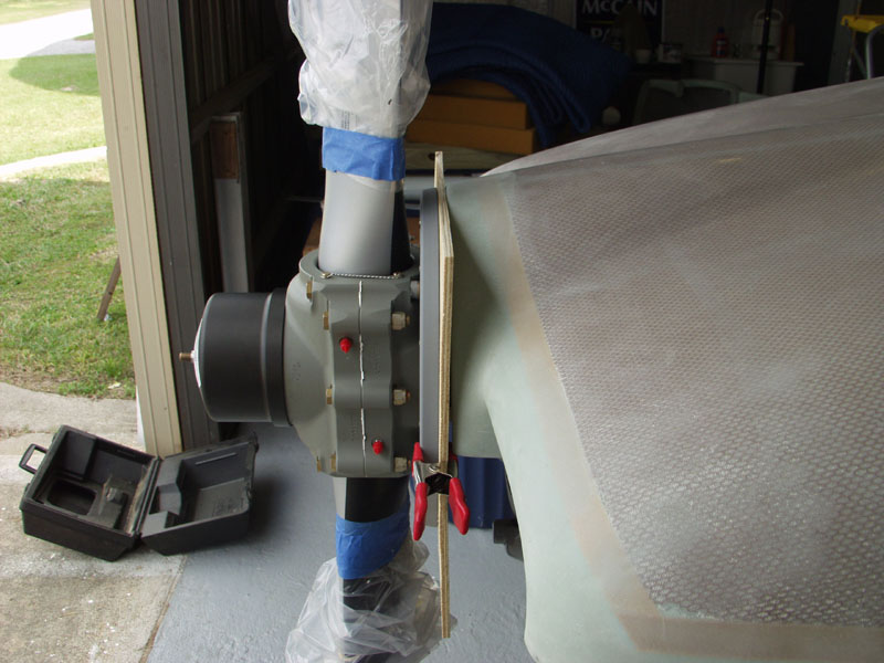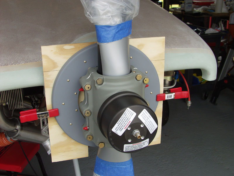 I put the prop in an up and down position and cut a piece of 1/4 inch plywood 14 x14 square. I measured the space around the prop with a piece of paper and cut a slot in it. The paper template sit on top of the 2 bolts that hold the prop spinner plate to the prop. My thought was if I cut a slot this shape in the plywood it would sit square on these bolts. I cut the slot and slide it in place. Next i marked a line around the perimeter of the spinner plate and cut off the rest with a jig saw. This allows to see the cowl edge in relation to the spinner.