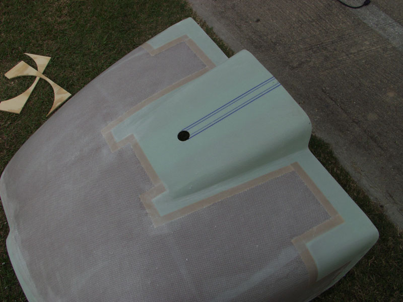 Still not ready to make the cut. So I move on to the bottom cowl. The slot should be 1 and 3/8 wide. So I used a ruler that was almost that wide to get the center and marked a spot in the center and 12 and 5/8 forward from the rear of the cowl. I used a large unibit to drill a hole which will give the nice front edge of the slot. Then I marked up the sides to make the slot the proper width. I used a jig saw to cut the slot. Came out perfect.