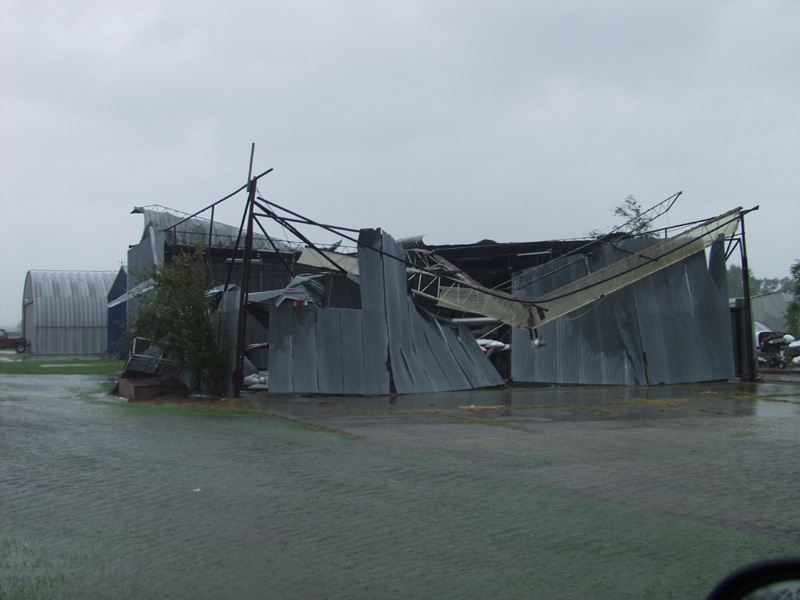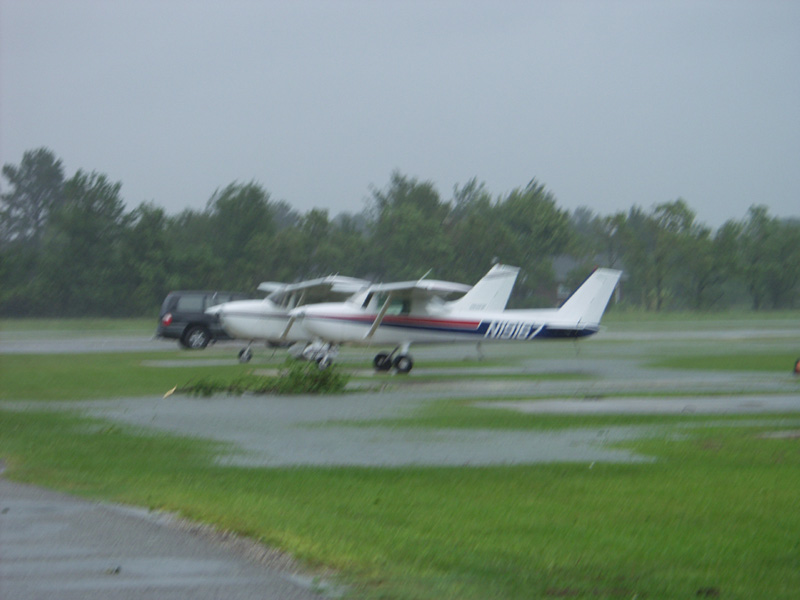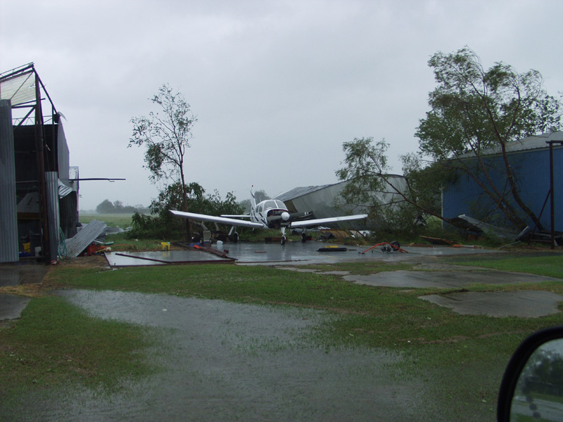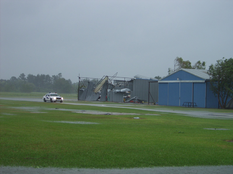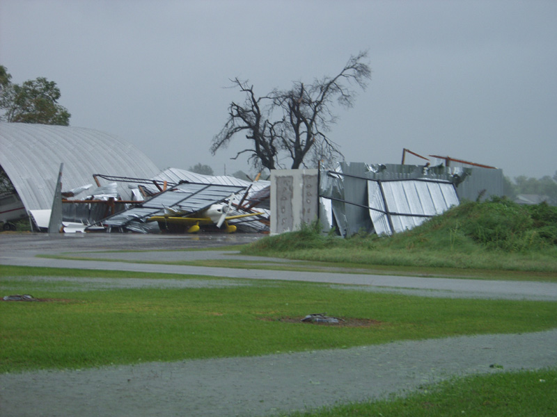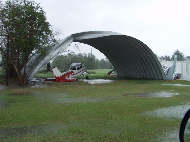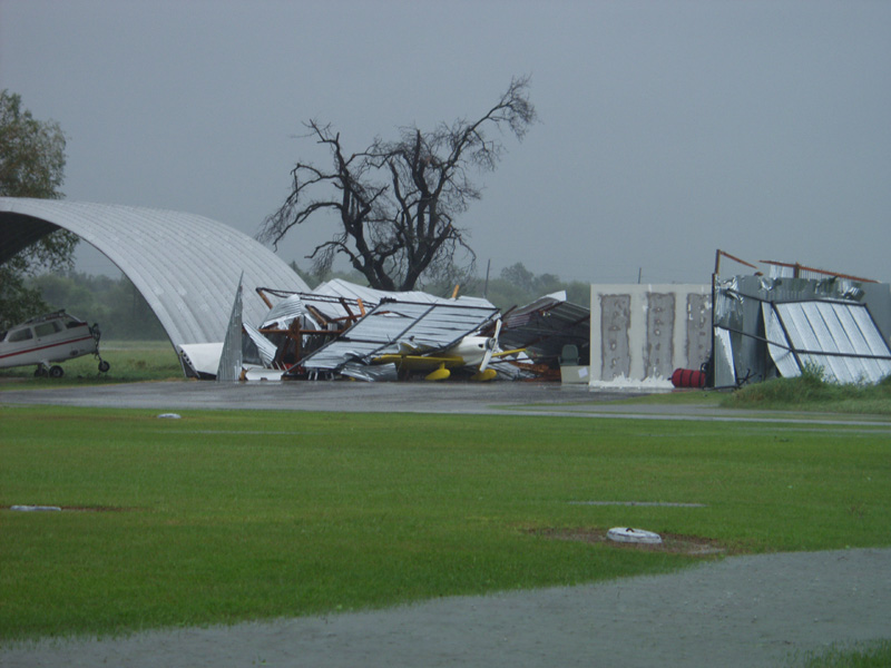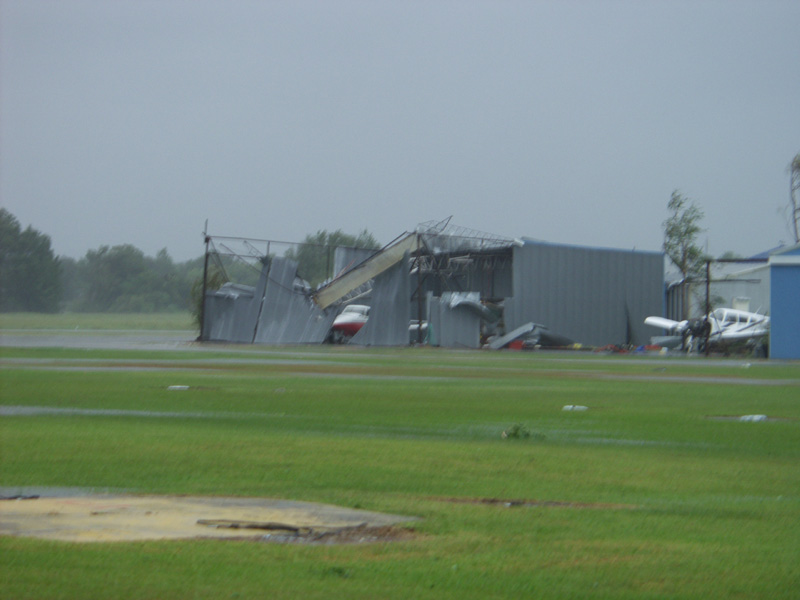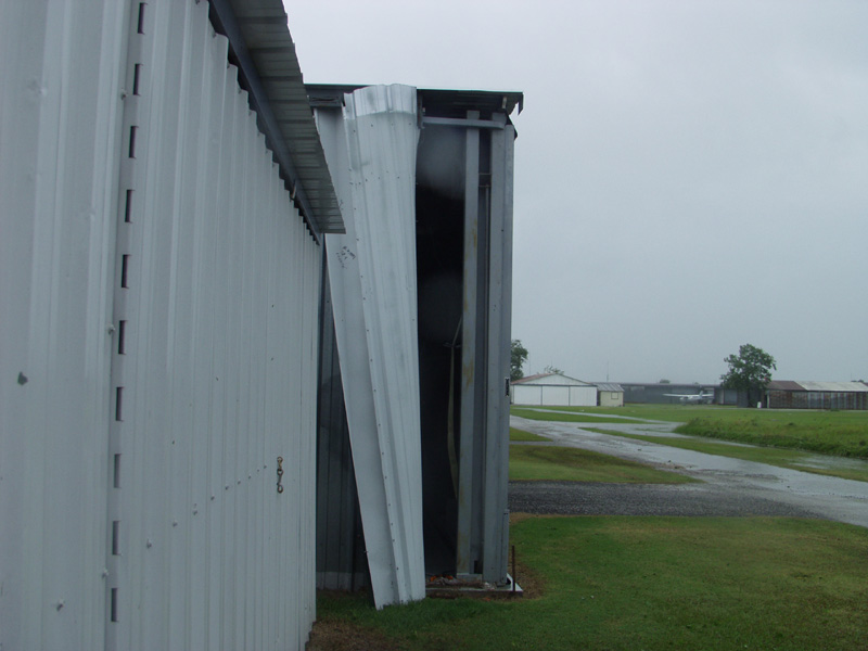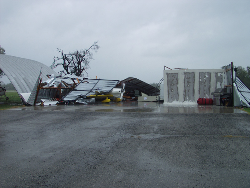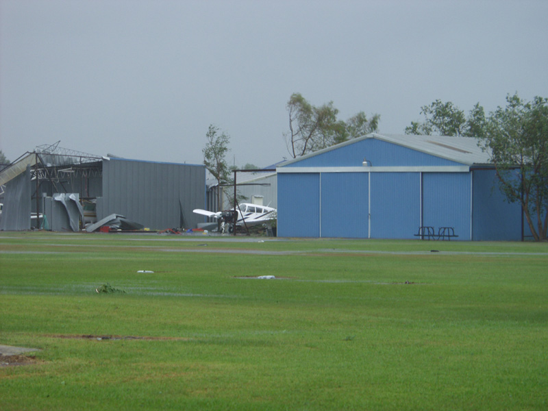 When I pulled in the front gate I saw the first 2 planes parked out front and I felt better. Then I saw the hangar right in front of my hangar. The entire top was torn off halfway up the walls. Those of us on the back row against the fence did not get any damage. My front doors pushed in a bit even with all the extra bracing. We were very lucky. I don't know how the planes that were tied down outside made it.