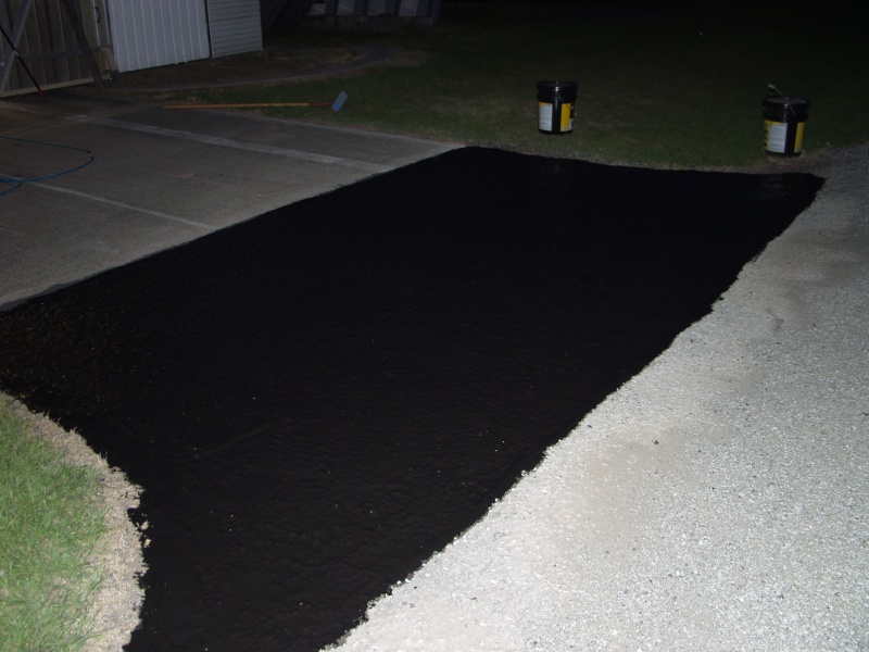 Then I dumped it out about 25% at a time and started spreading. I put it on pretty thick this time. This was a new bucket so it was mixed well and much thinner than last time. The firts time I did it the bucket had seperated and it was really thick in the bottom of the bucket and I had to stir it up alot to get it to mix. Came out pretty nice.