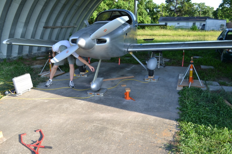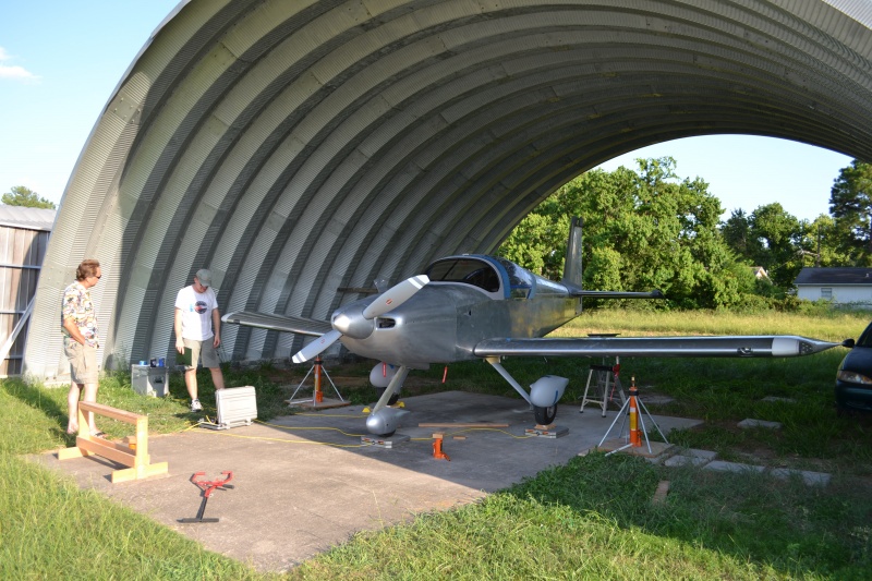 So we got the wing jacks out and got the bird up on the scales. Next step was to level it which took multiple times of jacking and shimming with small pieces of wood that I cut from scraps I had in the hangar. The goal was to get the plane all leveled and then jack up one last time to zero out the scales with the shims in place so they don't become part of the final weight. Turns out this is called tear weight. Not sure if I spelled that correctly, have to ask John. Now we do all the measurements with plumbbobs off the leading edge of the wing and figure out the datum and arms and moments.... I won't bore you with the details. This is all aircraft fabrication stuff that us builder pilots have to do... :)