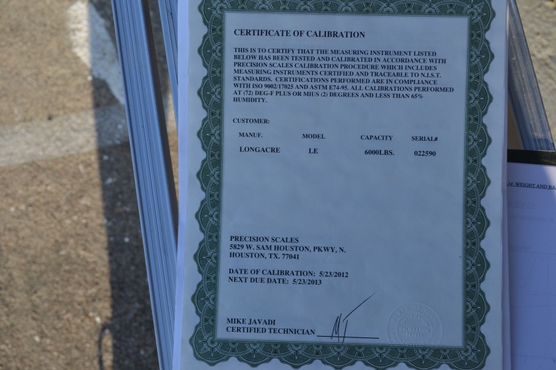 Ok so now was the moment of truth. The plane is leveled.... the scales are zeroed out with shims in place. The plane is lowered back down into position for the final weigh in. John powers up the panel and we have a total weight of 1,142 lbs. I snapped a pic of the panel and the certification of calibration of the scales as they were just done about 2 months ago. And now its time for the DAR inspection.