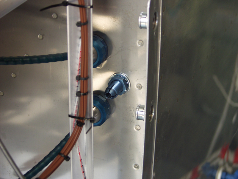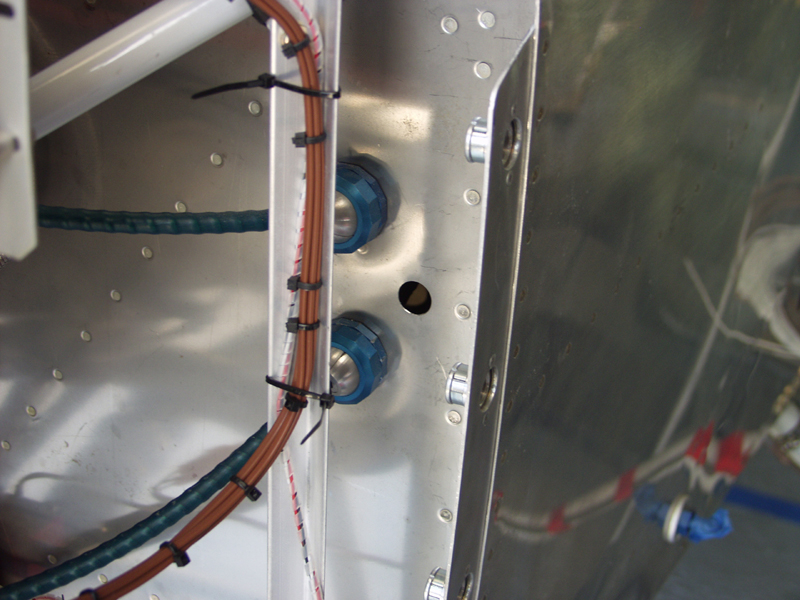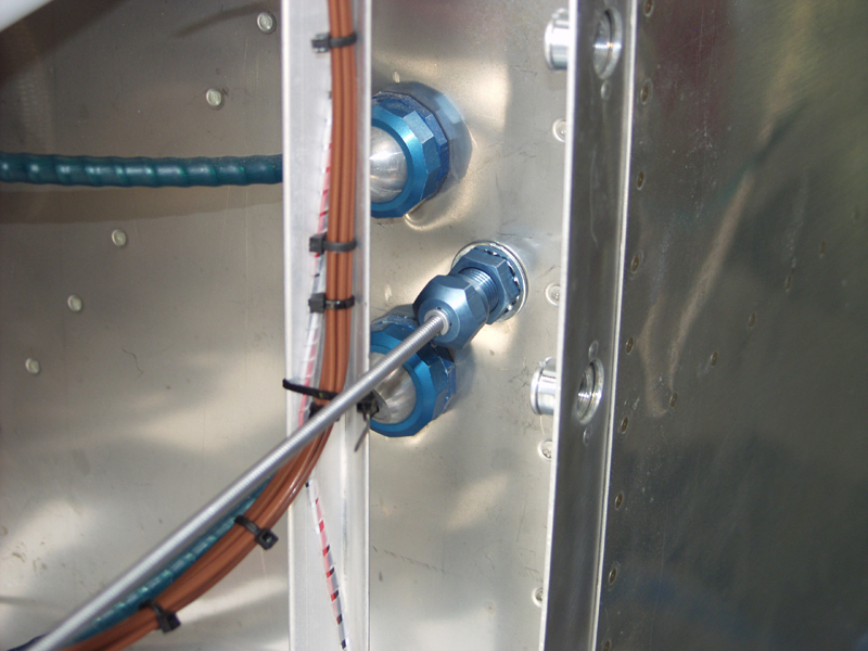 Settled just above the parking brake cable knob. I will get a label from ACS for it and it will be done. This worked out to be a straight shot to the firewall and then down a bit. Exit was right next to the mixture and prop control cables. I used a cable safe exit from ACS. I need to wait to get the AFS EFIS reinstalled before I put the lock nuts on and then it will be complete.