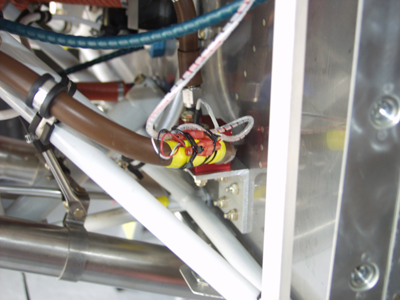 Next I put some yellow electrical tape around the fuse hose I wanted to tiewrap the wiring to the RED CUBE. This is the fuel flow sensor that feeds data to the engine analyzer. The firesleeve is probably sufficent but the tape is just a bit more protection in case vibration tries to chafe the firesleeve.