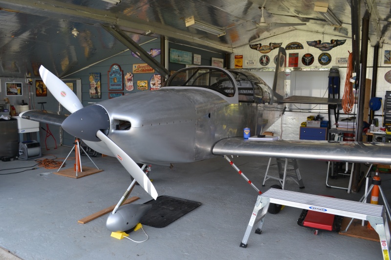 So now it was time to complete the prepping. Don't forget anything! The interior is complete. Panel is all checked out with labels. Nose wheel pant back on. Moved 5 gallons of fuel from left side to right to even the load. Prop spinner fresh prime and back on. Hopefully Jim won't notice the dark grey change and thinking I am copying him. His is black by the way. That's my story and I am sticking to it.