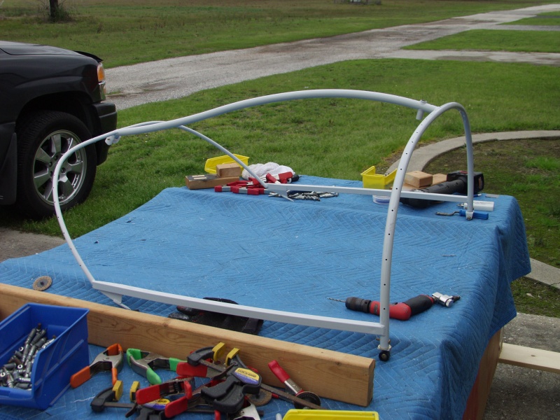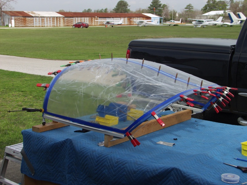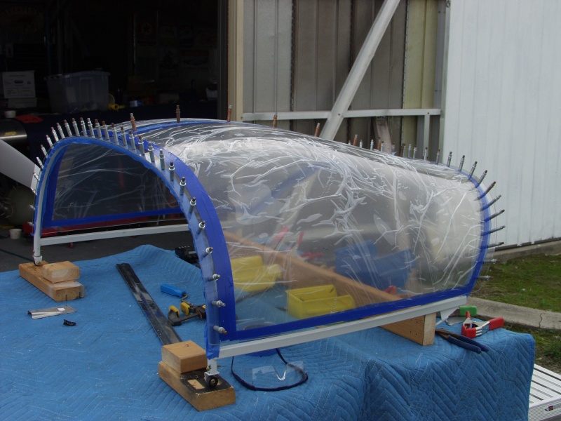 Installed the frame to the fuselage. Clecoed the canopy in place on the frame and checked the rear bow and the front bow to the windscreen. It appears there are several low spots that will need to be shimmed up to match the windscreen.