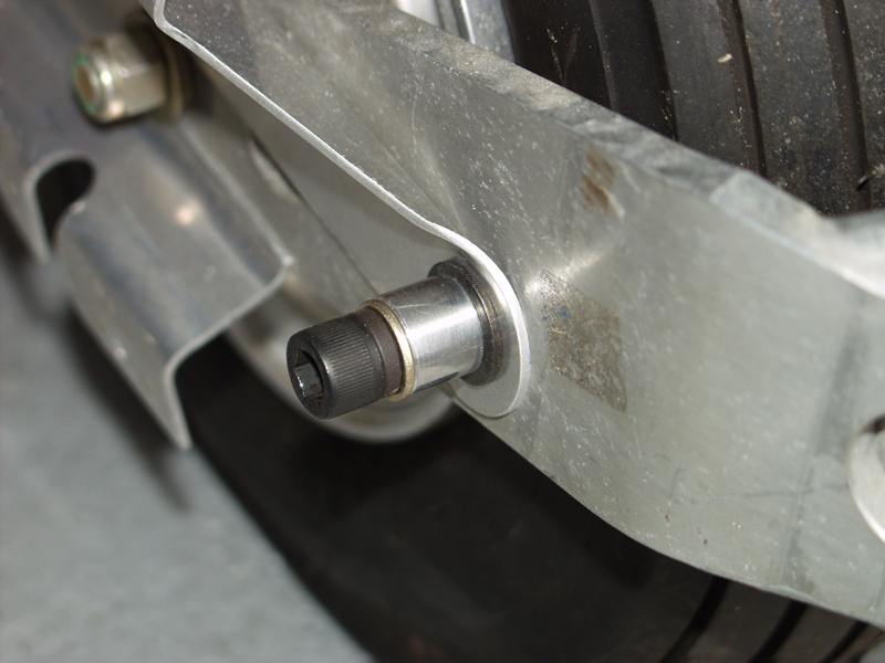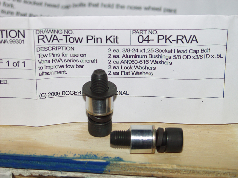 Ok if you building an A model with the nose gear you will need a Bogie Bar to tow the plane as the other brands will not spread around the nose gear fairings. In addition you will need the tow pin adapters to give enough length. As you can see in the picture its a longer cap screw with a bushing and 2 washers and a lock washer to replace the ones from Vans. I had to add washers to the ones from Vans anyway to keep the screw from going thru the fork and hitting the tire. This was no big deal since you need the length for the to bar forks. The next 2 pics show the before and after picture to show the length.