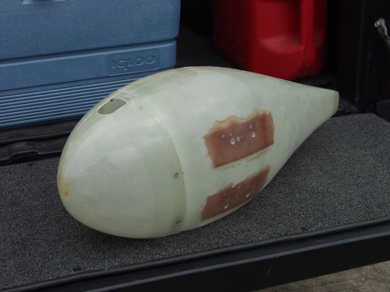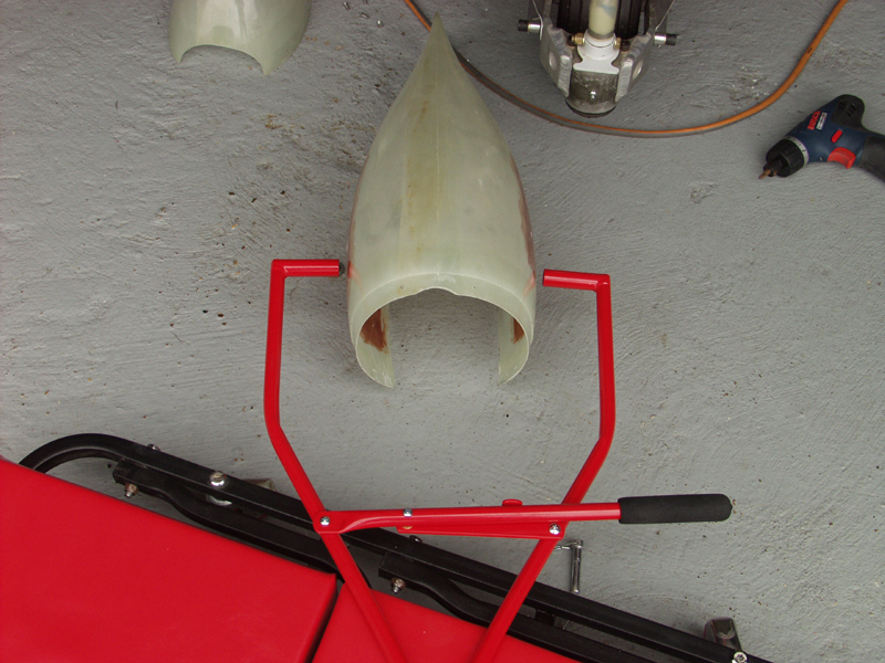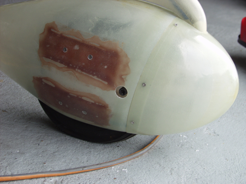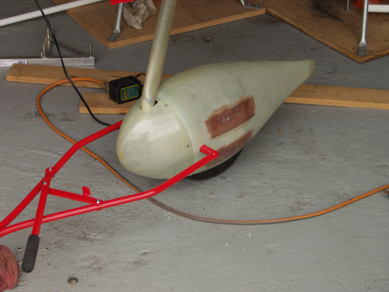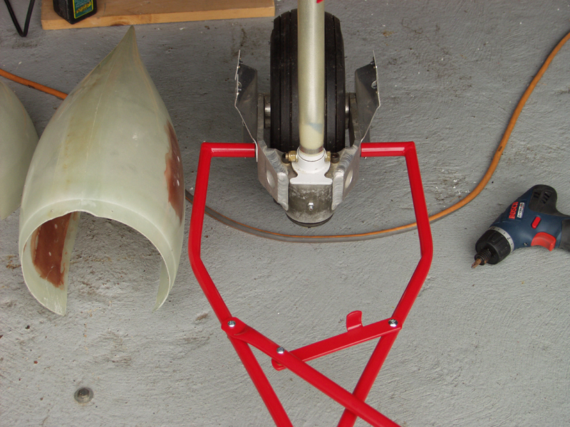 Once these were replaced I was able to see the cap screw head and I drilled a #40 pilot hole in the center of the dark spot where the screw head showed in the gear fairing. Came out perfect. I took a few pics of the tow bar from Bogert. It really spreads wide to clear the fairing and the fits right over the screw caps. A few more cuts to get the proper clearance around the tire and its ready to sand and prime. Next I worked on the nose gear fairing. I laid up 2 plys of glass and epoxy right where the fairing goes down to the clamp below the hole in the top of the nose fairing. This fiberglass work is so time consuming.