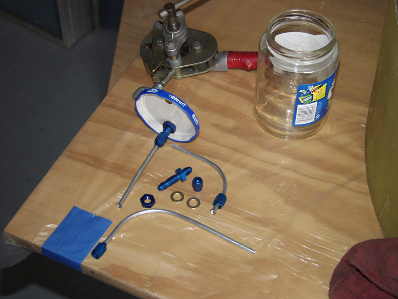 Last I found a neat gadget to purge the brakelines on VAF. I fabbed up the parts and added the pickle jar. Its all ready to fill up the brake lines. Just pour the brake fluid in the jar. Use the air gun to the input side and attach the long line to the purge valve. Open up the valve and add air pressure. Should push the fluid right up the lines to the resevoir. Should work great.