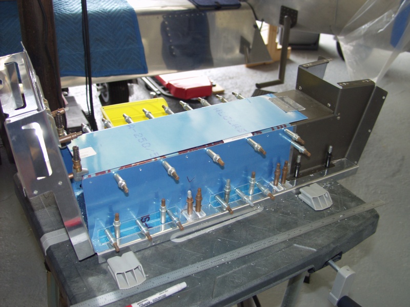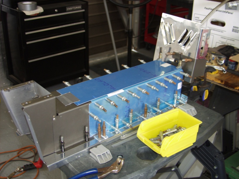Arrived at the hangar to start on the enclosure. First I laid out the center piece and the newly cut carpet and snapped a pic. Next I started out thinking I was going to mount the angle on the outside corners but it made more send to put them on the inside so I cut the top corner pieces in length and used the rivet fan to layout the line of rivets. I drilled on the drill press with the fan in place clecoing as I went.