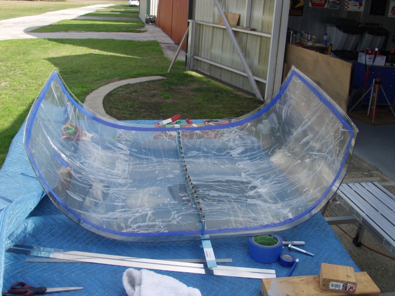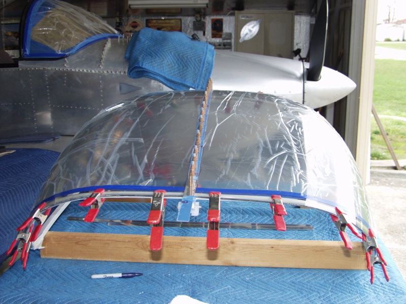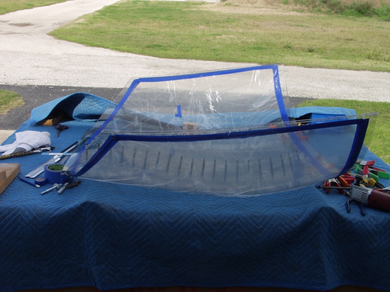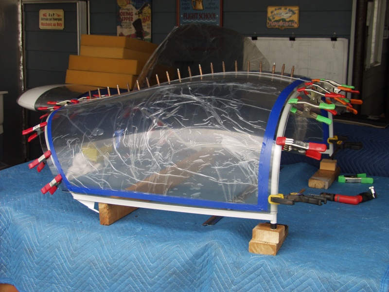 Sunday I removed the canopy frame and drilled all the holes to #40 on the top cross bar of the frame. Then I marked the next trim lines and removed the pastic and tapped with electrical tape. I trimmed to the marks and then removed the canopy from the frame so I could back drill the top center strip. Next I removed the strip and enlarged the holes to #30 in the strip and the canopy.