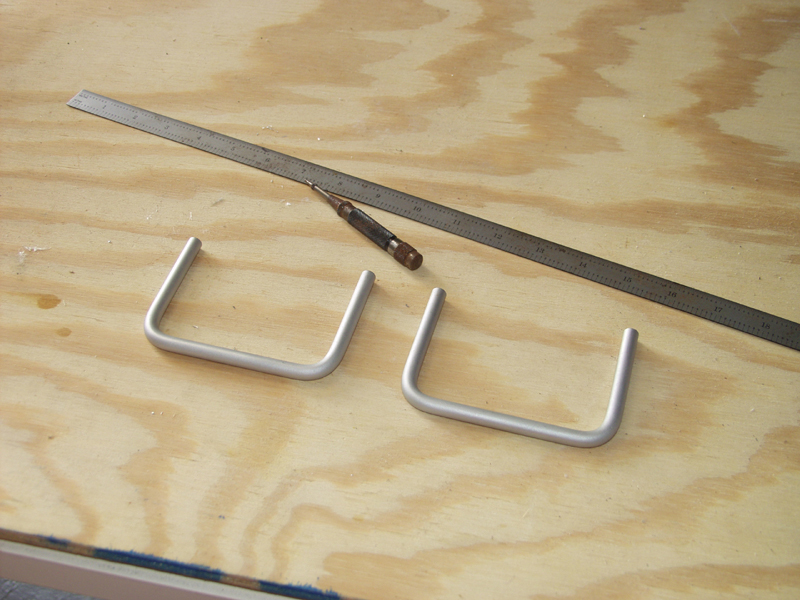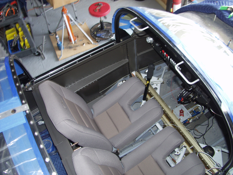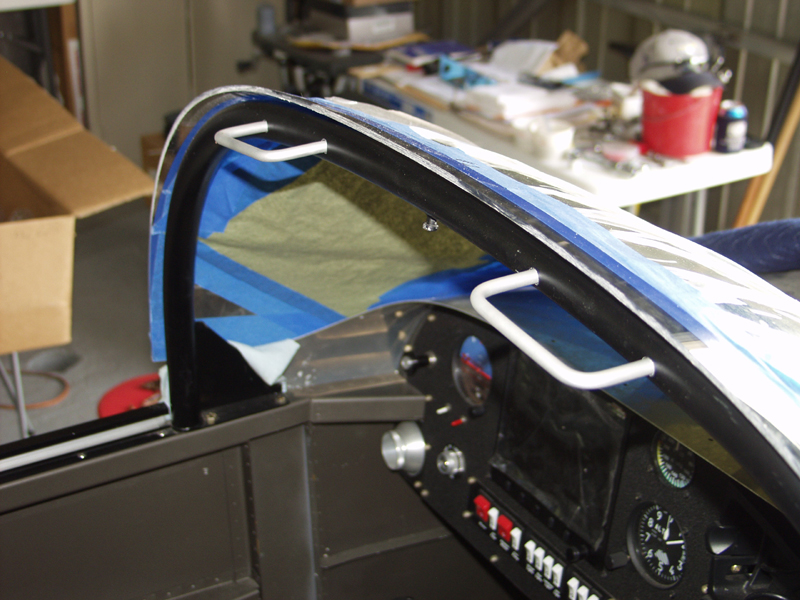 Next I dug out my roll bar handles I picked up from Aircraft Extras way back when. With these you drill #12 holes for a 3A bolt as they are threaded in the ends. On the cockpit side you enlage the holes with a unibit so the handle slides into the rollbar and the bolt pulls the handle up to the insde of the roll bar nice and snug. You have to be careful to allow clearence for the sliding canopy to clear the handles. Climbing in and out of a 6 or 7 can be challenging on a slider as the natural reaction is to want to put your hand on the bow of the sliding part of the canopy. Big no no! Any way I drilled these sitting in the seats and once installed they proved to be a very sturdy hand hold. I am trying to decide if I want to paint these red to match my lock handle on the slider. Probably not just due to constant hand holding rubbing the paint off.