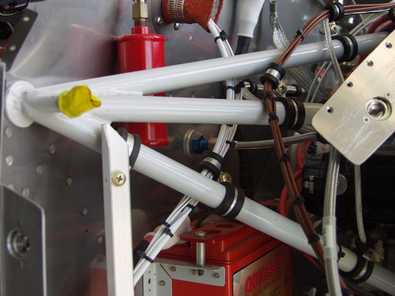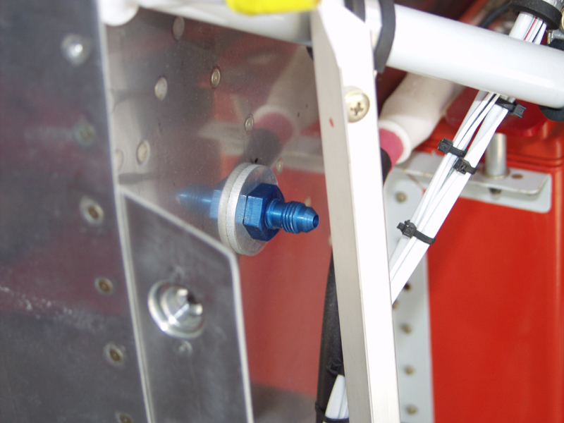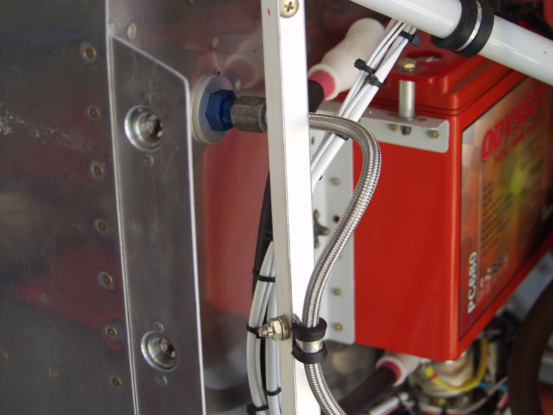 Now it was time to start doing the things on the list I made on the white board. This list has been things that I was waiting to do with the top skin off. First thing was to pull the fuel flow wires from inside to exit the firewall since I installed the Red Cube on the firewall. I found those wires and ohmed them out to confirm they were the right ones. Next I moved the MAP sensor hose from the stupid location I originally put it right above the battery box. One day I was standing there looking things over and it hit me.... how will I be able to pull the battery out with that bulhead fitting in the way. So that went on the list. Once the skin was off I could see the only thing I had to do was drill a new bulkhead hole as the sensor has a rubber hose from the sensor to the back of the bulkhead fitting. I moved it to the left of the battery box under the brake resevoir. Once that was done I removed the adel clamps and used the small one to tie it to the wiring bracket on the side.