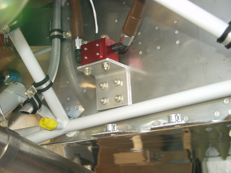Last was the Red Cube bracket. It was just clecoed in place so I used 4 4A bolts and metal lock nuts. Gary showed up at the hangar so I asked him to help as it was a long reach from the top to hole the wrench on the bolts as he racheted the nuts from the front. Wrenched the hoses on the connections and we are done. Next will be to drill the brake master cylinders to the bottom of the rudder pedals..... O Goody... I get to climb under the panel! ouch... I am getting to old for this stuff.