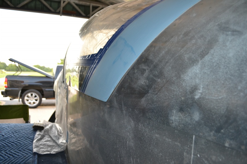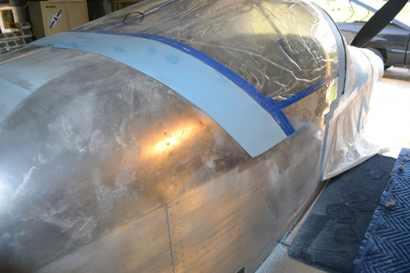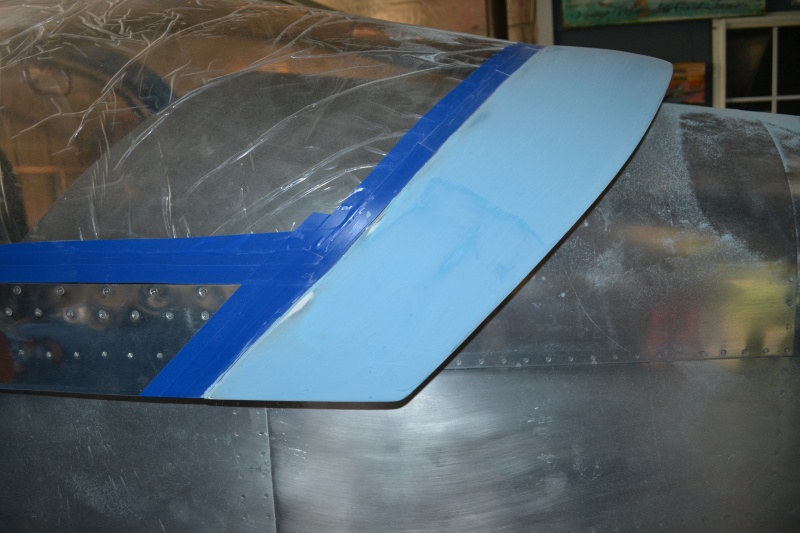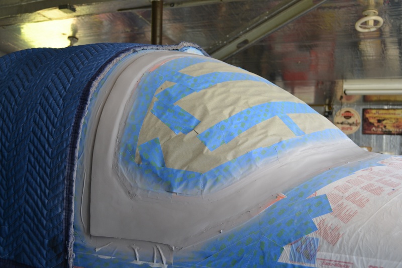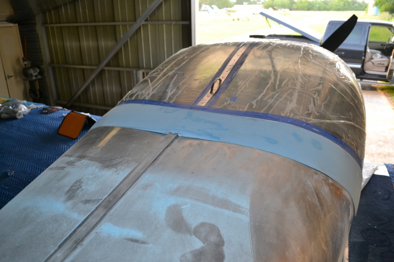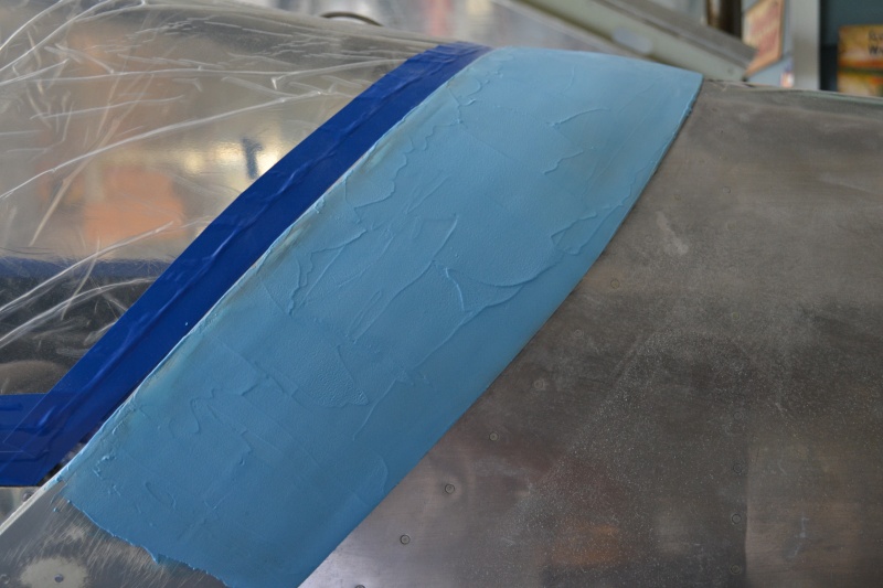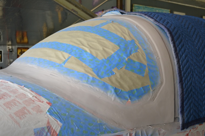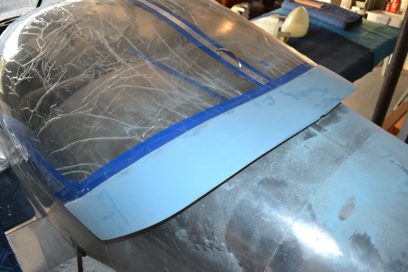 You can see from the pics the process of adding filler and sanding to find more pinholes and pits. Repeat. Anyway I got to the point I wanted to shoot primer so I tapped up the painting paper over the plastic. Just wanted to make sure there were no leaks. Next I covered up any areas around to keep any overspray off and then it was time. After leaving over night it was time to pull the plastic to check the final edge. I was really pleased once it was remover. I had a few places where the epoxy mix leaked just a tiny bit under the second layer of tape. In these areas I just used a exacto knife to trim to match the edge line and it looks pretty good now. The painter can make it look perfect. This baby needs to fly!