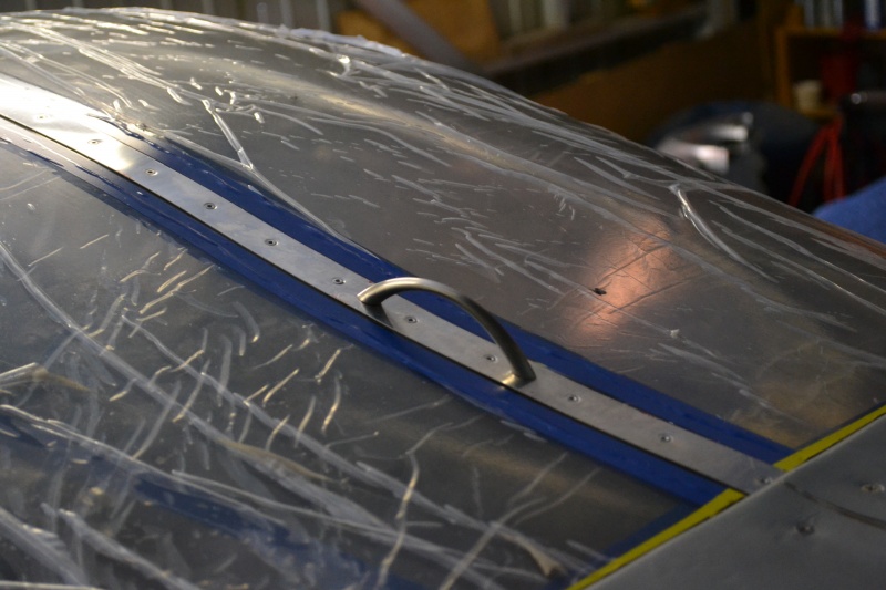 Last I drilled 2 holes in the center cross bar bow of the rear canopy and installed a handle to assist in opening the canopy. The handle is sleek and should be aerodynamic.