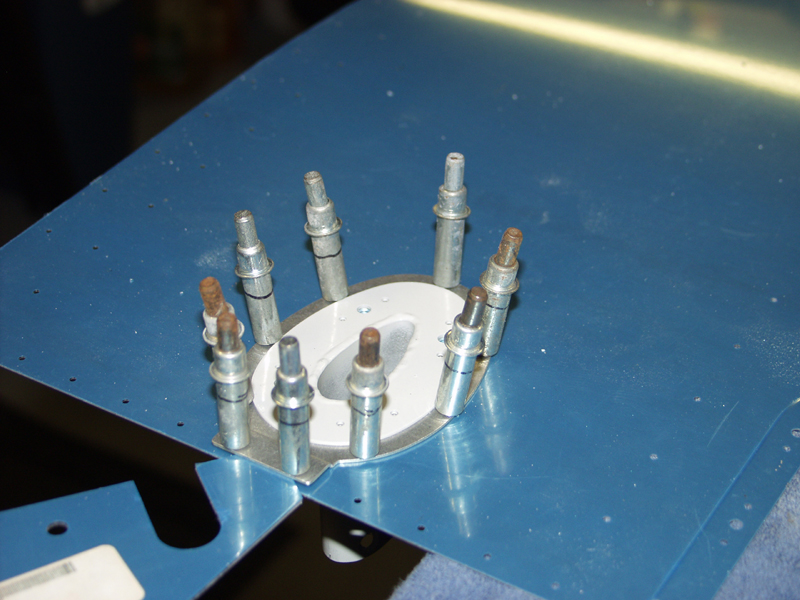 I had to shim it to lie flat to drill the outside edge holes. I used the bellcrank jig for thickness. Worked out great. Next I marked the hole for the mount to slide thru. I used a dremill tool to cut the hole going slowly to get a nice fitting hole. Once the piece dropped out I used a file to get it really smooth. It took a while to get the mount to drop thru the hole smoothly. Drilled the 7 outside edgeholes with the Pitot mount in place to make sure everything stayed centered while drilling.