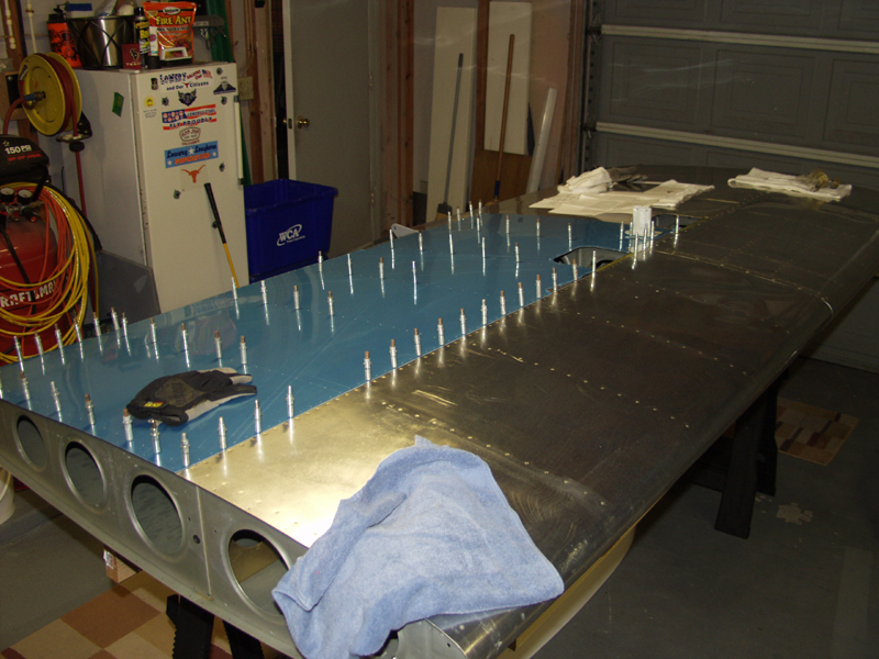 Moving on to the Pitot tube. In review of the directions it says to not install in the same bay as the bellcrank so I moved one bay outboard of that. I centered the bracket to pickup 2 rivets along the main spar. I used those 2 rivet holes to drill into the brace. Removed and deburred and installed on the bottom skin in those 2 matching holes.