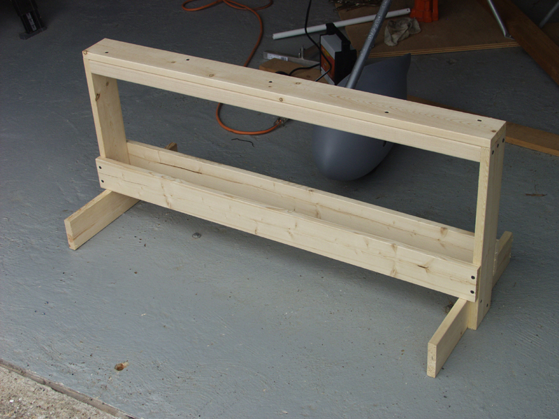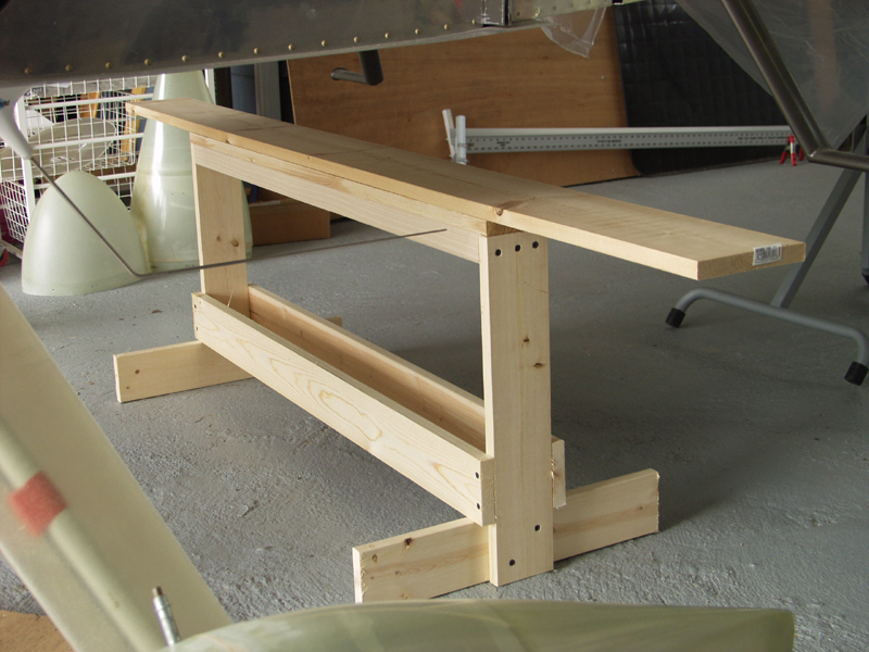 On the way to the hangar I stopped at Lowes for some wood to build some stands. I liked the way Jim used stands to run sting lines to get the alignment of the gear fairings. So I built up 2 stands. I built the stands the width of the fuselage roughly at the widest point. Then I will used 6 foot boards clamped in position to get the extra width of the gear legs.