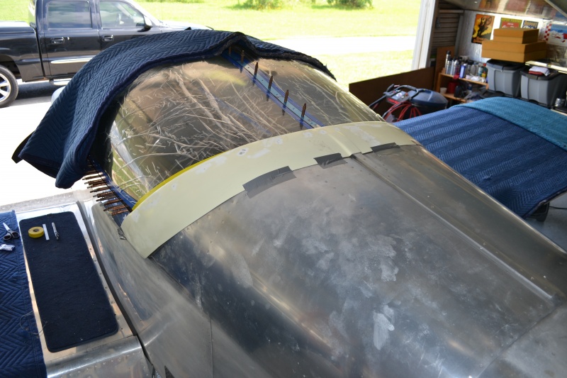 I then went to the rear canopy where I left off last time and tapped the right side like I did last week on the left. I drilled all the holes thru the rear canopy bow and tapped and installed screws on every other hole. Now it is held tight. I test fit the fiberglass piece and it looks like it will work out good.