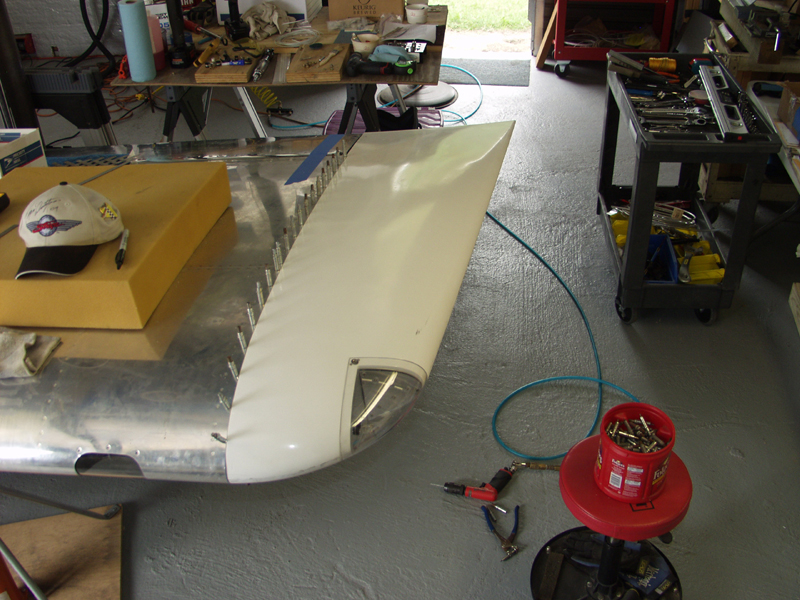 Next I started drilling the wing tip in place. I started at the leading edge and worked my way back. With the rear rib in place I was able to make sure the trailing edge stayed in line with the aileron. I alternated every few holes by drilling some in the bottom and then back to the top until it was complete. Then I removed the tip and cleaned up the drill shavings.
