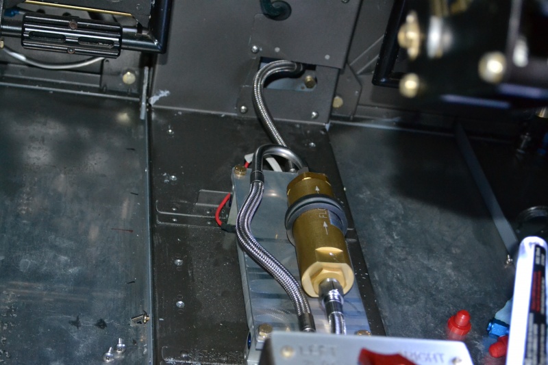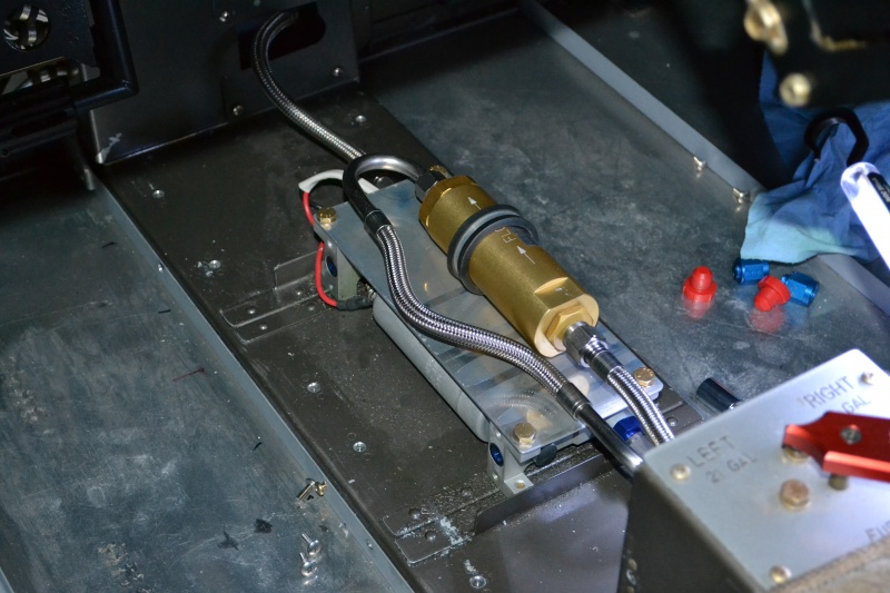 Well back to building for a little bit again. Tom at TS Flightlines fixed me up with flex lines to replace my hard lines from the fuel valve to the fuel pump. I just like these stainless braided lines better and Tom is the man to go to. I cannot recommend him enough. One evening I was checking my emails and when I answered him back he was online at the same time. He actually took my order real time and had them built and shipped out the next day. This one here next to the filter did not fit correctly so he remade it for me. Since I was sick with an ear infection this week I reordered it and he turned it around in 2 days. Now that is service.