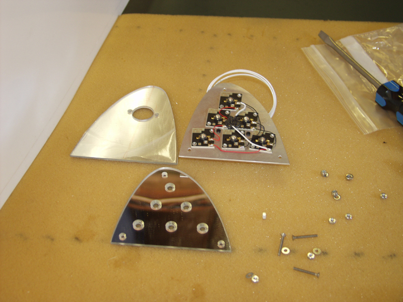 Last you drill a hole for the strobe bulb to fit from behind and then drill 2 screw holes. Then you put the mirror in place and fit the bulb in from the back and install screws. All I have left is 2 nutplate on the bottom and top corners to hold the lens in place.