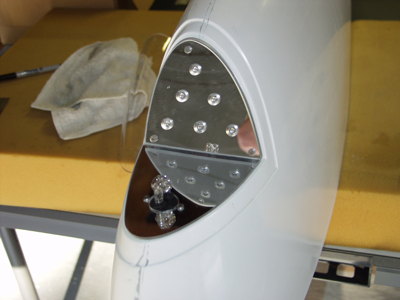 Today I knocked out the wingtip lights. I got these from Jeff a few years ago. I started the first one yesterday. That is when I could see that I was going to have to trim the glass. The Strobe piece fits flat against the fiberglass but the LED lights have a heatsink and the glass has a spacer bolt to hole the glass above the LED's.